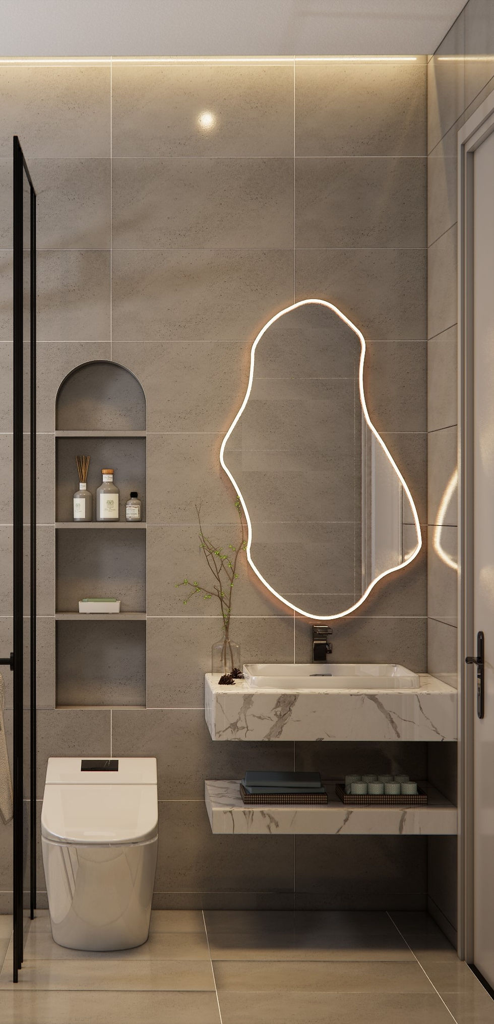 O destaque do espaço é o espelho com iluminação LED embutida, de forma orgânica, que confere identidade e dinamismo ao ambiente. A bancada esculpida em mármore com prateleira inferior reforça a sofisticação, enquanto os nichos embutidos em arco oferecem praticidade e um toque decorativo sutil.
